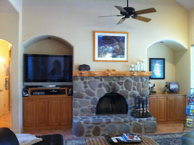 Starting with the main room, we addressed the fireplace mantel and stone, ,floor tile, as well as the arch entertainment niches , furnishings, and cabinet stains.